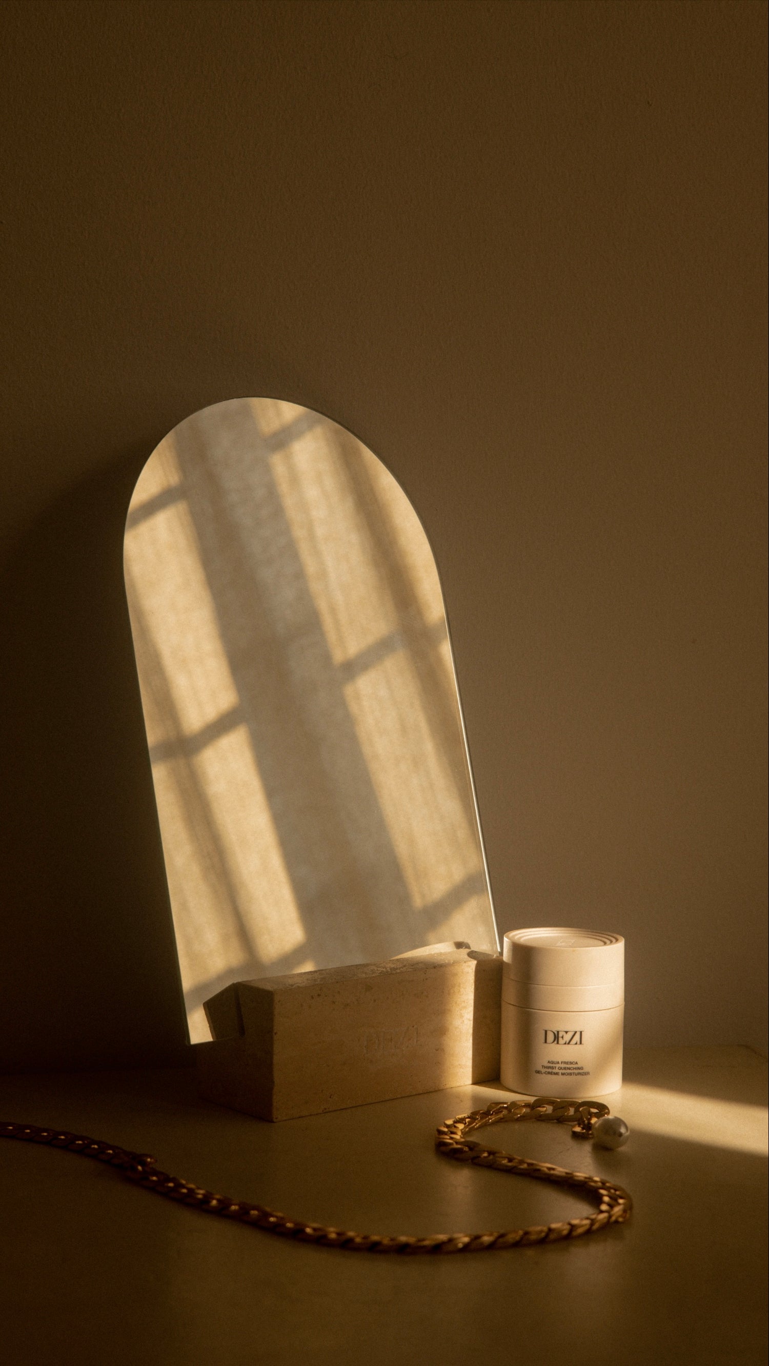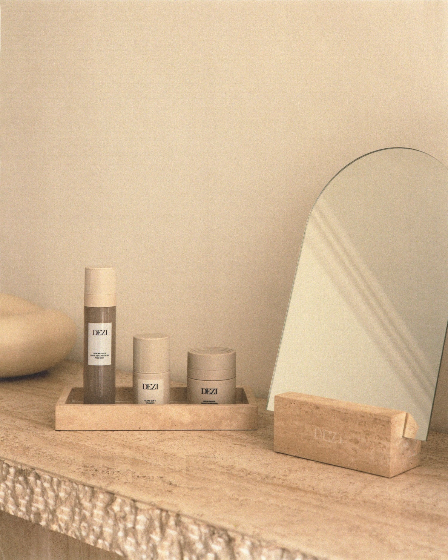 Custom design with the distinct DEZI arch. This iconic mirror and travertine stone base is a beautiful object for everyday use.