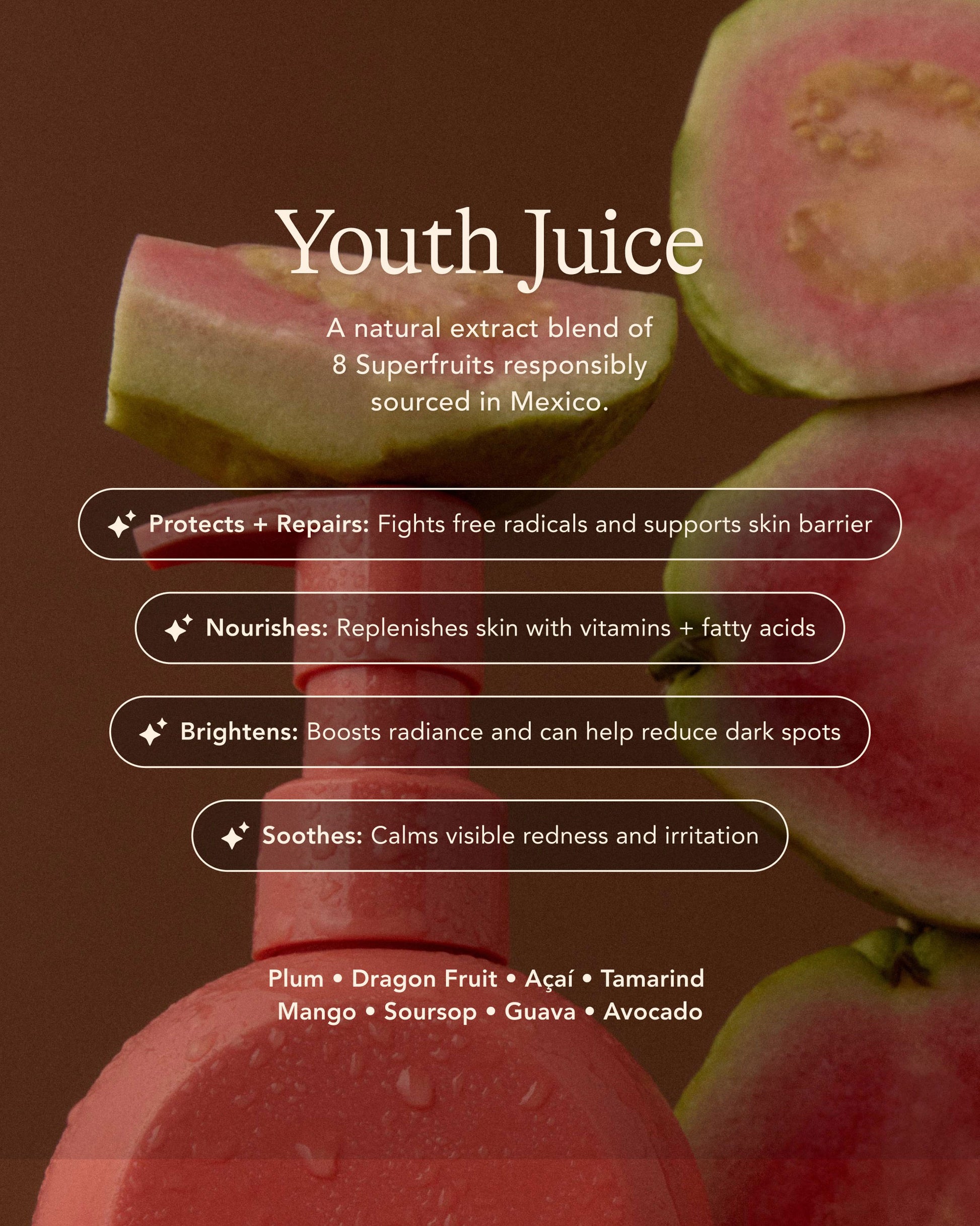 - Antioxidant-packed ingredients in our DEZI YOUTH JUICE; A custom blend of all-natural, Mexican extracts including: Mexican Plum fruit, Dragon Fruit, Açai Berry, Tamarind, Mango, Soursop, Guava, and Avocado. This blend is rich in antioxidants and responsibly-sourced in Mexico. Help prevent environmental damage on your skin.