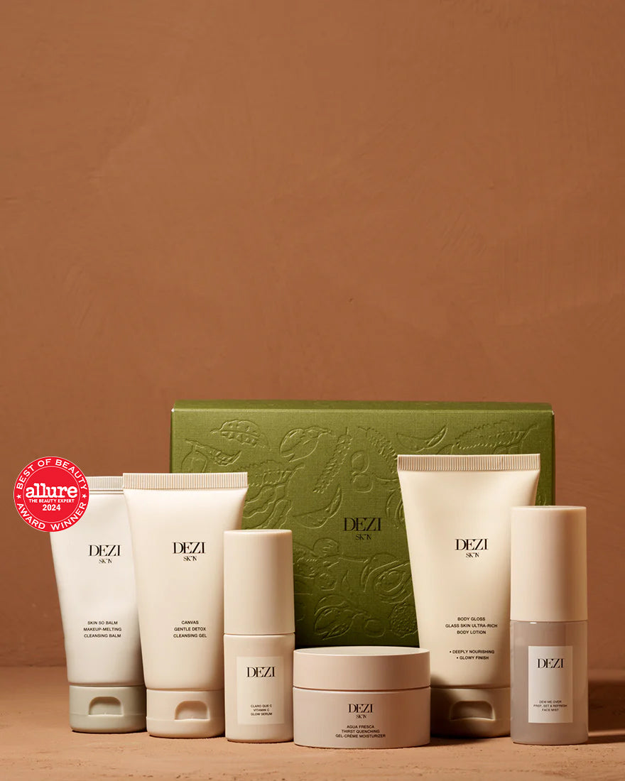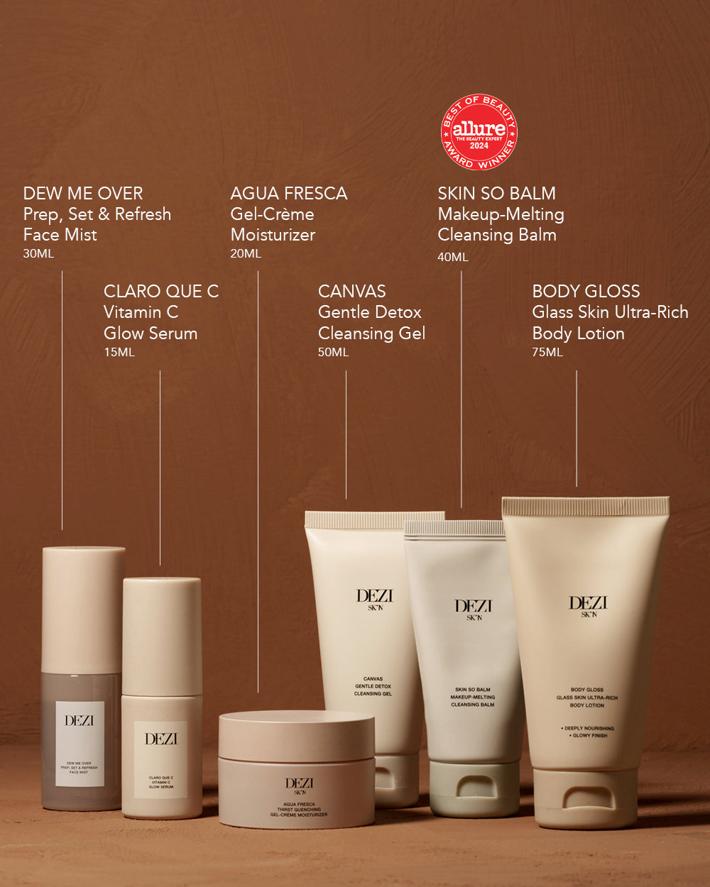 Six travel size products + a bonus gift, our Dezi Skin Mercado Bag.